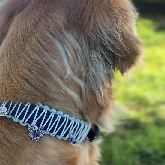 Dieses Biothane Halsband kombiniert Langlebigkeit mit einem besonderen Design-Highlight: Der kunstvoll geflochtene Kobra-Knoten aus Paracord verleiht dem Halsband eine markante, strukturierte Optik mit sportlich-elegantem Charakter. Die enge, symmetrische Knotung sorgt nicht nur für einen einzigartigen Look, sondern setzt auch einen stilvollen Farbakzent.